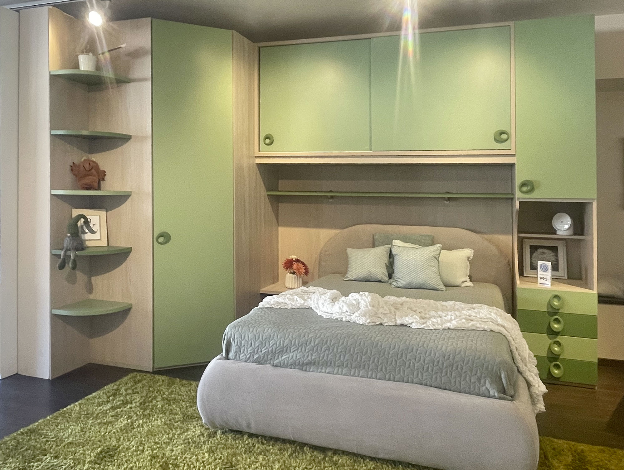 Composizione cameretta con ponte scorrevole, cabina angolo, elemento terminale e modulo 1 ante e cassetti.