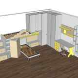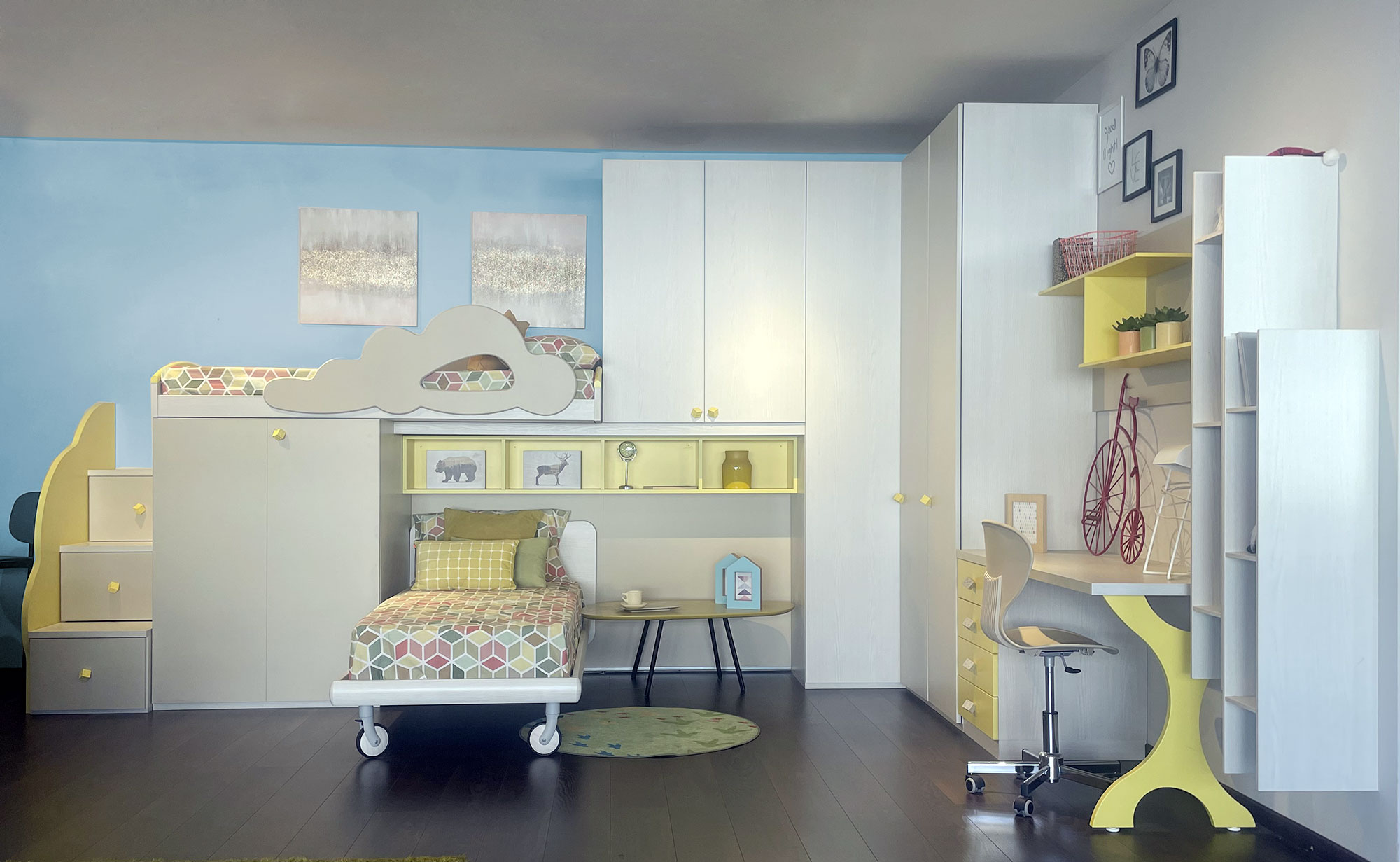 Composizione cameretta con letto soppalco , armadio angolare, scrivania con libreria e sedia.